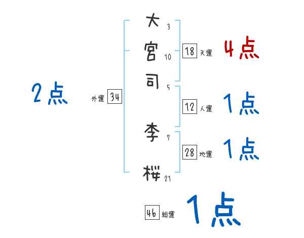 天運![]() | 大宮司李桜さんの天運は18画の4つ星!情熱的で剛気。忍耐力があり信頼される。 家系が持つ宿命的な運勢を表します。祖先から受け継いだ苗字ですので自分の力が及びません。家柄を象徴します。 |