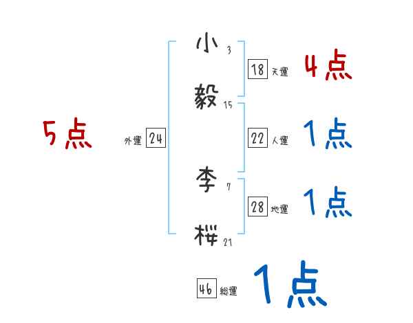 外運![]() | 小毅李桜さんの外運は24画の5つ星!家庭運が良く順調な人生。金運にも恵まれる。 生活面を象徴する運勢です。外部から受ける影響力を表し、結婚運、家庭運や職場、環境への順応性を表します。 |