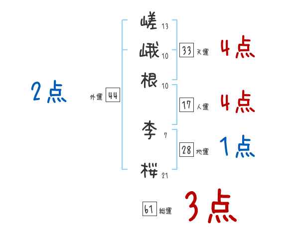 天運![]() | 嵯峨根李桜さんの天運は33画の4つ星!権力志向でプライドが高い。勇気があり運を切り開き成功する。 家系が持つ宿命的な運勢を表します。祖先から受け継いだ苗字ですので自分の力が及びません。家柄を象徴します。 |