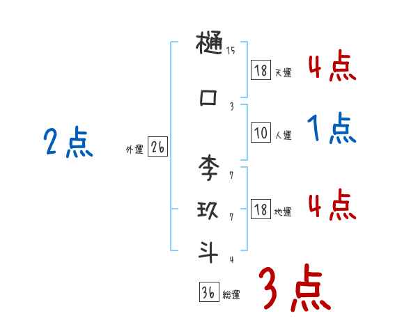 総運![]() | 樋口李玖斗さんの総運は36画の3つ星!先見性が豊かです。多少神経質で苦労することも。 あなたの人生を表す1番重要な運勢です。生涯を通じて影響する総合運となり、主に50歳以降の晩年期に影響を及ぼします。 |