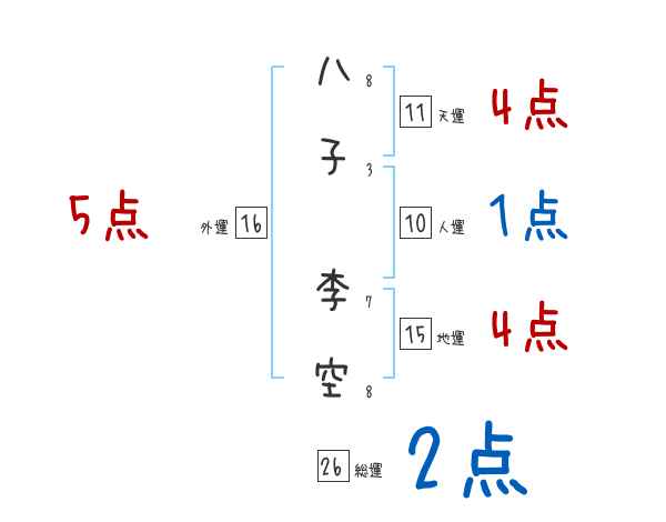 外運![]() | 八子李空さんの外運は16画の5つ星!人望が厚く大きく発展する。逆転成功が見える。 生活面を象徴する運勢です。外部から受ける影響力を表し、結婚運、家庭運や職場、環境への順応性を表します。 |