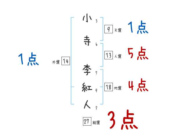 天運![]() | 小寺李紅人さんの天運は9画の1つ星!消極的で才能を発揮することが苦手なことも。周りの意見に耳を傾けましょう。 家系が持つ宿命的な運勢を表します。祖先から受け継いだ苗字ですので自分の力が及びません。家柄を象徴します。 |