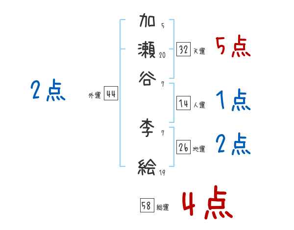外運![]() | 加瀬谷李絵さんの外運は44画の2つ星!誠実で慎重な性格。物事を考えすぎないように注意しましょう。 生活面を象徴する運勢です。外部から受ける影響力を表し、結婚運、家庭運や職場、環境への順応性を表します。 |