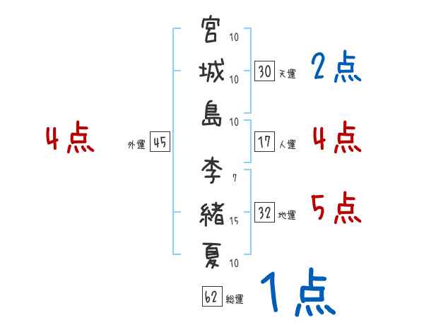 地運![]() | 宮城島李緒夏さんの地運は32画の5つ星!柔軟性があり成功する。チャンスが多く金運が良い。 個性を表す基礎的な運勢です。性格形成や対人関係、行動力など家庭環境に影響されます。主に誕生してから20歳くらいまでの若年期の運勢を表します。 |