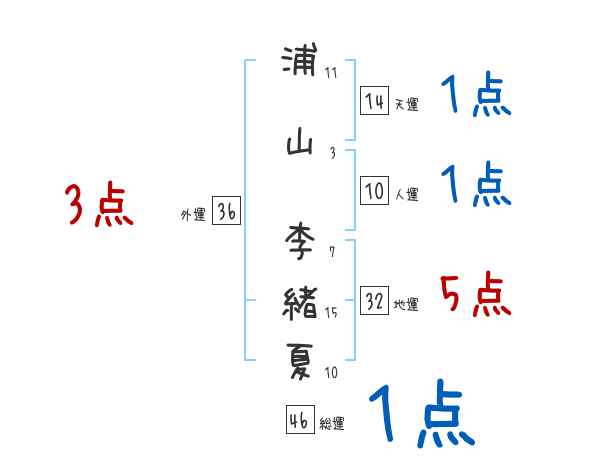 外運![]()  | 浦山李緒夏さんの外運は36画の3つ星!先見性が豊かです。多少神経質で苦労することも。 生活面を象徴する運勢です。外部から受ける影響力を表し、結婚運、家庭運や職場、環境への順応性を表します。 |
