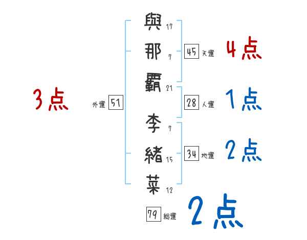 外運![]() | 與那覇李緒菜さんの外運は51画の3つ星!変化が激しく、危険に注意。堅実な性格。 生活面を象徴する運勢です。外部から受ける影響力を表し、結婚運、家庭運や職場、環境への順応性を表します。 |