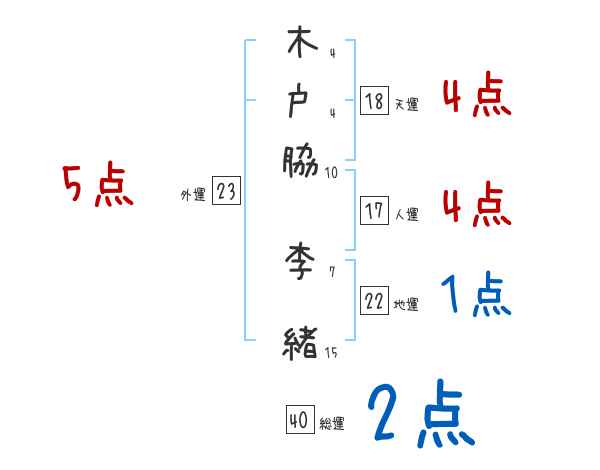 外運![]() | 木戸脇李緒さんの外運は23画の5つ星!想像力に優れ活力がある。一代で成功し名誉を手に入れる。 生活面を象徴する運勢です。外部から受ける影響力を表し、結婚運、家庭運や職場、環境への順応性を表します。 |