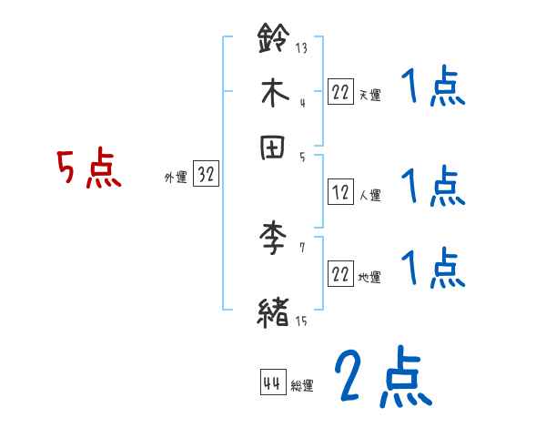 外運![]() | 鈴木田李緒さんの外運は32画の5つ星!柔軟性があり成功する。チャンスが多く金運が良い。 生活面を象徴する運勢です。外部から受ける影響力を表し、結婚運、家庭運や職場、環境への順応性を表します。 |