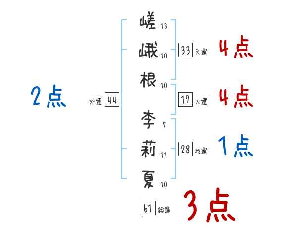 外運![]() | 嵯峨根李莉夏さんの外運は44画の2つ星!誠実で慎重な性格。物事を考えすぎないように注意しましょう。 生活面を象徴する運勢です。外部から受ける影響力を表し、結婚運、家庭運や職場、環境への順応性を表します。 |