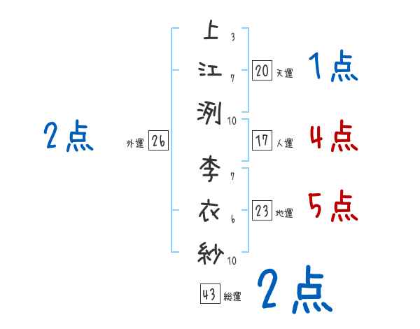 外運![]() | 上江洌李衣紗さんの外運は26画の2つ星!波瀾万丈かも。信頼できる人を大事にしましょう。 生活面を象徴する運勢です。外部から受ける影響力を表し、結婚運、家庭運や職場、環境への順応性を表します。 |