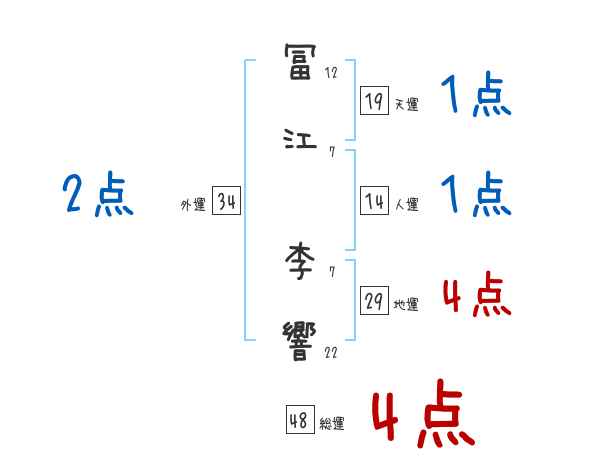 外運![]() | 冨江李響さんの外運は34画の2つ星!独創性に優れるが、自尊心が強く災難に注意しましょう。 生活面を象徴する運勢です。外部から受ける影響力を表し、結婚運、家庭運や職場、環境への順応性を表します。 |
