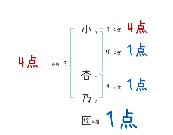天運![]() | 小杏乃さんの天運は3画の4つ星!活動的で才能に恵まれ、多くの信頼を得る。希望に満ち成長する。 家系が持つ宿命的な運勢を表します。祖先から受け継いだ苗字ですので自分の力が及びません。家柄を象徴します。 |