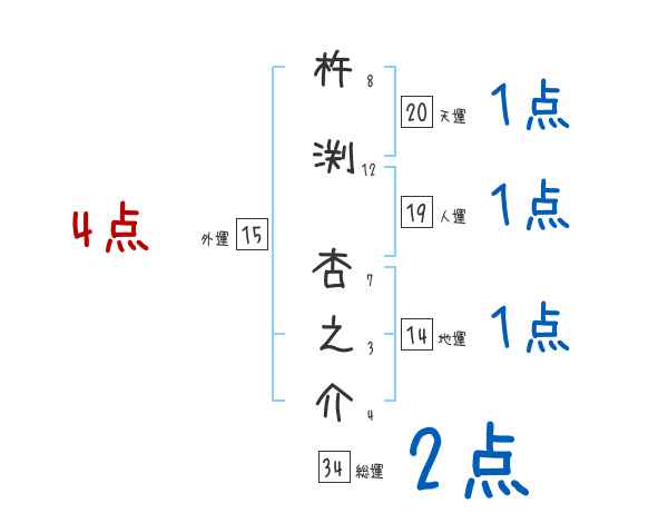 総運![]() | 杵渕杏之介さんの総運は34画の2つ星!独創性に優れるが、自尊心が強く災難に注意しましょう。 あなたの人生を表す1番重要な運勢です。生涯を通じて影響する総合運となり、主に50歳以降の晩年期に影響を及ぼします。 |