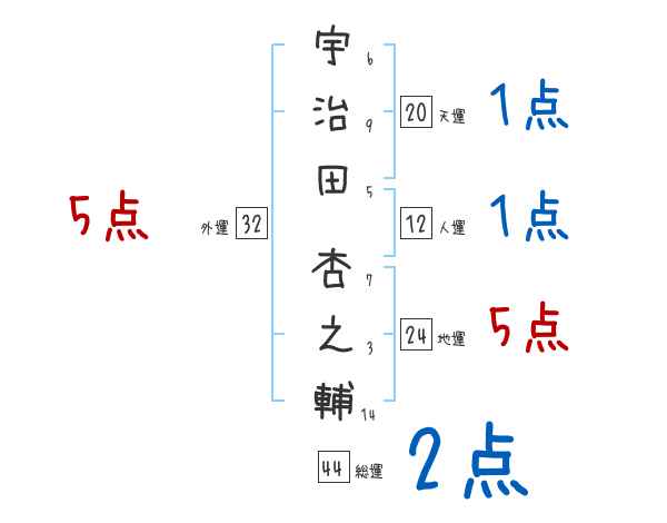 外運![]() | 宇治田杏之輔さんの外運は32画の5つ星!柔軟性があり成功する。チャンスが多く金運が良い。 生活面を象徴する運勢です。外部から受ける影響力を表し、結婚運、家庭運や職場、環境への順応性を表します。 |