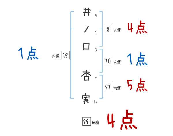 外運![]() | 井ノ口杏実さんの外運は19画の1つ星!優れた才能を持ちますが、協調性が足りないことも。周りの人と協力する事を意識しましょう。 生活面を象徴する運勢です。外部から受ける影響力を表し、結婚運、家庭運や職場、環境への順応性を表します。 |