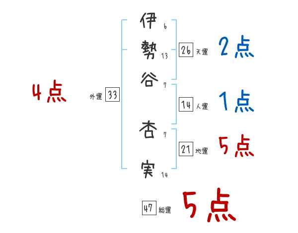 外運![]() | 伊勢谷杏実さんの外運は33画の4つ星!権力志向でプライドが高い。勇気があり運を切り開き成功する。 生活面を象徴する運勢です。外部から受ける影響力を表し、結婚運、家庭運や職場、環境への順応性を表します。 |