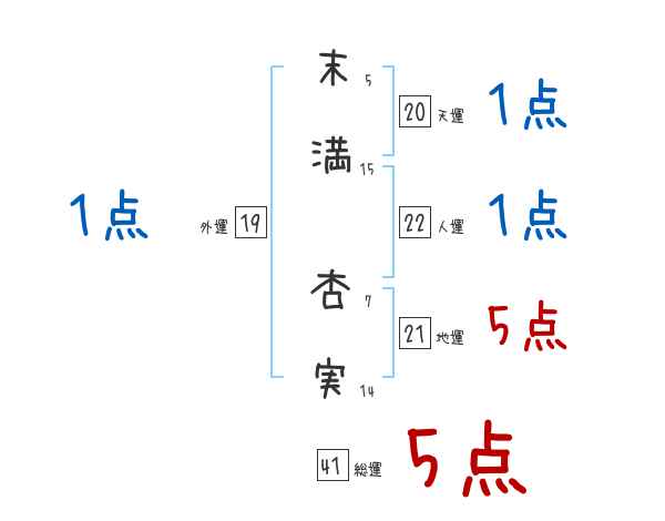 外運![]() | 末満杏実さんの外運は19画の1つ星!優れた才能を持ちますが、協調性が足りないことも。周りの人と協力する事を意識しましょう。 生活面を象徴する運勢です。外部から受ける影響力を表し、結婚運、家庭運や職場、環境への順応性を表します。 |