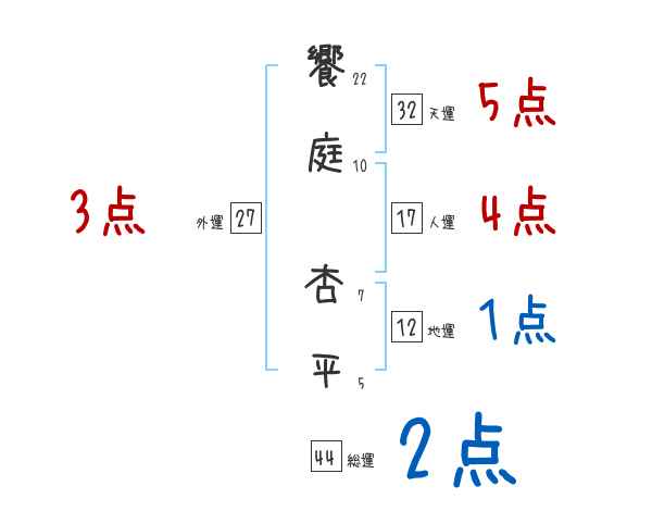 天運![]() | 饗庭杏平さんの天運は32画の5つ星!柔軟性があり成功する。チャンスが多く金運が良い。 家系が持つ宿命的な運勢を表します。祖先から受け継いだ苗字ですので自分の力が及びません。家柄を象徴します。 |