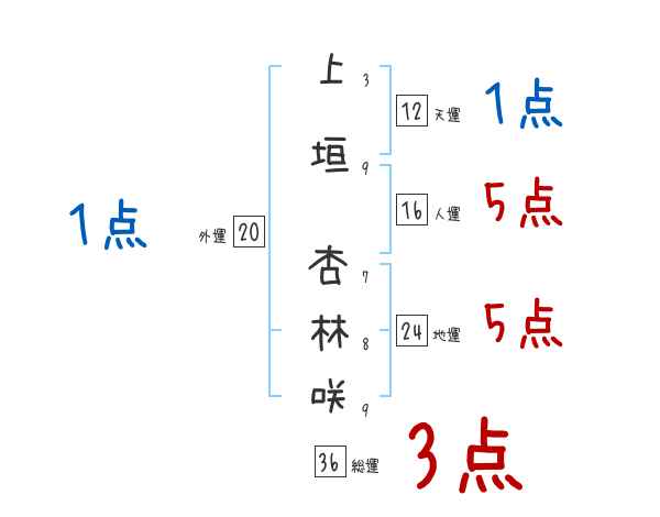 総運![]() | 上垣杏林咲さんの総運は36画の3つ星!先見性が豊かです。多少神経質で苦労することも。 あなたの人生を表す1番重要な運勢です。生涯を通じて影響する総合運となり、主に50歳以降の晩年期に影響を及ぼします。 |