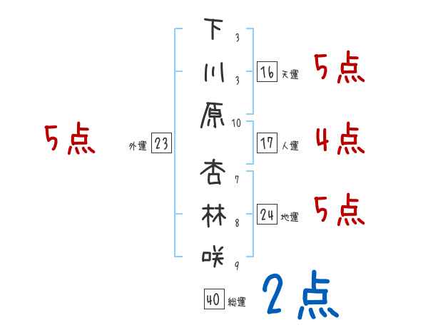 天運![]() | 下川原杏林咲さんの天運は16画の5つ星!人望が厚く大きく発展する。逆転成功が見える。 家系が持つ宿命的な運勢を表します。祖先から受け継いだ苗字ですので自分の力が及びません。家柄を象徴します。 |