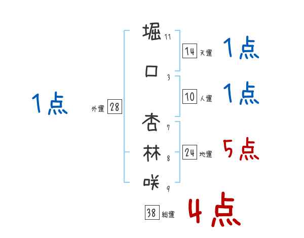 外運![]() | 堀口杏林咲さんの外運は28画の1つ星!家庭環境に注意。スポーツで活躍できる能力があるかも。 生活面を象徴する運勢です。外部から受ける影響力を表し、結婚運、家庭運や職場、環境への順応性を表します。 |