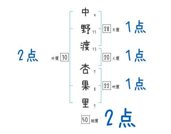 天運![]() | 中野渡杏果里さんの天運は28画の1つ星!家庭環境に注意。スポーツで活躍できる能力があるかも。 家系が持つ宿命的な運勢を表します。祖先から受け継いだ苗字ですので自分の力が及びません。家柄を象徴します。 |