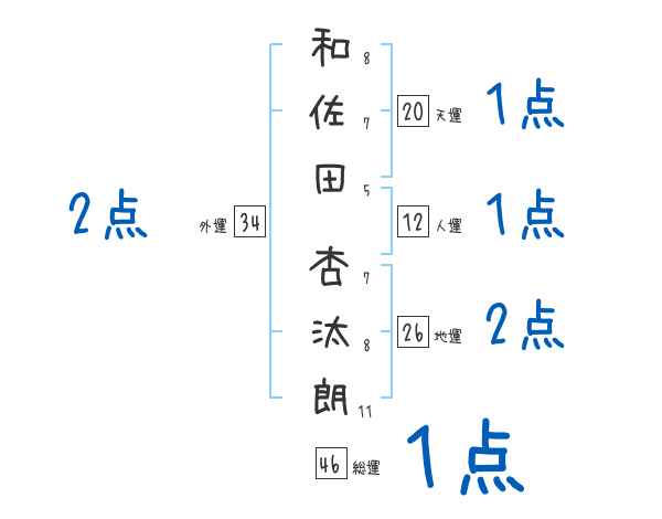 総運![]() | 和佐田杏汰朗さんの総運は46画の1つ星!迷走することが多く苦労するかも。目先のことにとらわれないように。 あなたの人生を表す1番重要な運勢です。生涯を通じて影響する総合運となり、主に50歳以降の晩年期に影響を及ぼします。 |