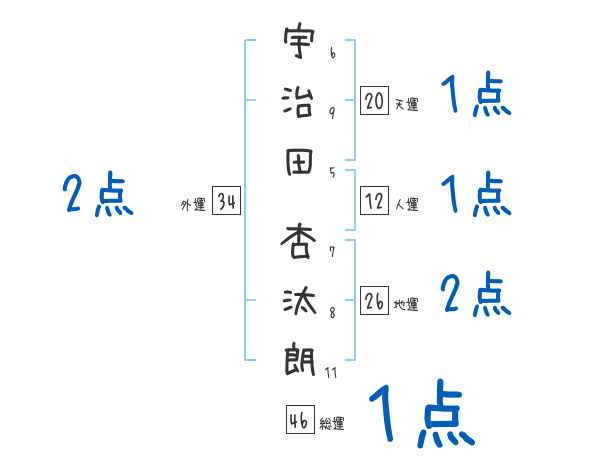 総運![]() | 宇治田杏汰朗さんの総運は46画の1つ星!迷走することが多く苦労するかも。目先のことにとらわれないように。 あなたの人生を表す1番重要な運勢です。生涯を通じて影響する総合運となり、主に50歳以降の晩年期に影響を及ぼします。 |