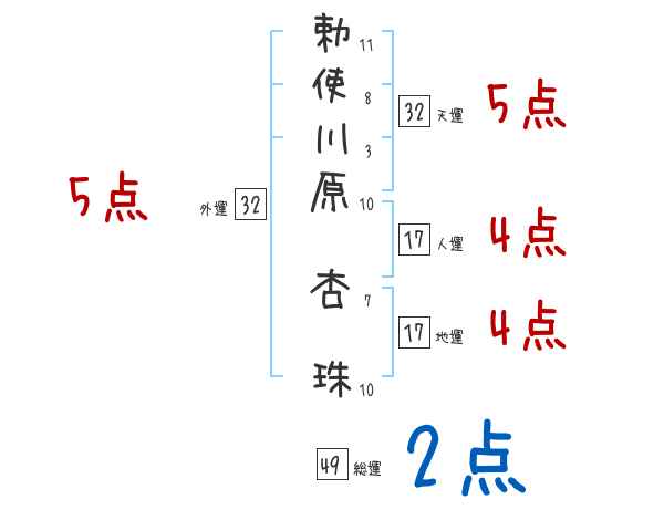 天運![]() | 勅使川原杏珠さんの天運は32画の5つ星!柔軟性があり成功する。チャンスが多く金運が良い。 家系が持つ宿命的な運勢を表します。祖先から受け継いだ苗字ですので自分の力が及びません。家柄を象徴します。 |