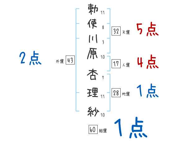天運![]() | 勅使川原杏理紗さんの天運は32画の5つ星!柔軟性があり成功する。チャンスが多く金運が良い。 家系が持つ宿命的な運勢を表します。祖先から受け継いだ苗字ですので自分の力が及びません。家柄を象徴します。 |