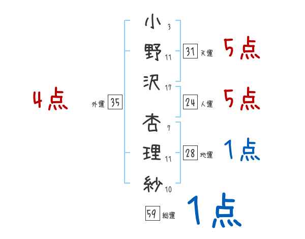 外運![]() | 小野沢杏理紗さんの外運は35画の4つ星!温厚な性格で感受性が高い。穏和な性格で人望が厚い。 生活面を象徴する運勢です。外部から受ける影響力を表し、結婚運、家庭運や職場、環境への順応性を表します。 |
