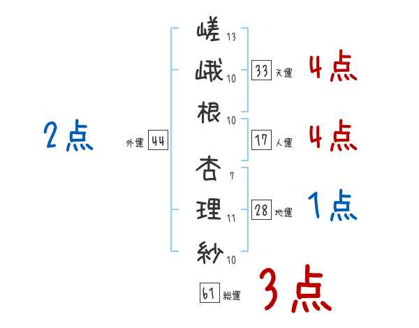 総運![]() | 嵯峨根杏理紗さんの総運は61画の3つ星!強情な性格でうぬぼれタイプ。自ら破滅する。 あなたの人生を表す1番重要な運勢です。生涯を通じて影響する総合運となり、主に50歳以降の晩年期に影響を及ぼします。 |
