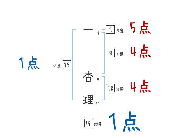 天運![]() | 一杏理さんの天運は1画の5つ星!行動力、指導力があり出世し繁栄する。幸運に恵まれる。 家系が持つ宿命的な運勢を表します。祖先から受け継いだ苗字ですので自分の力が及びません。家柄を象徴します。 |