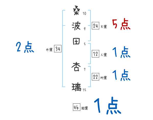 天運![]() | 桑波田杏璃さんの天運は24画の5つ星!家庭運が良く順調な人生。金運にも恵まれる。 家系が持つ宿命的な運勢を表します。祖先から受け継いだ苗字ですので自分の力が及びません。家柄を象徴します。 |