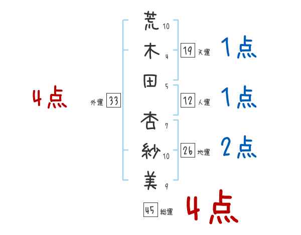 総運![]() | 荒木田杏紗美さんの総運は45画の4つ星!もくもくと物事を進め達成する。地味な努力家。 あなたの人生を表す1番重要な運勢です。生涯を通じて影響する総合運となり、主に50歳以降の晩年期に影響を及ぼします。 |
