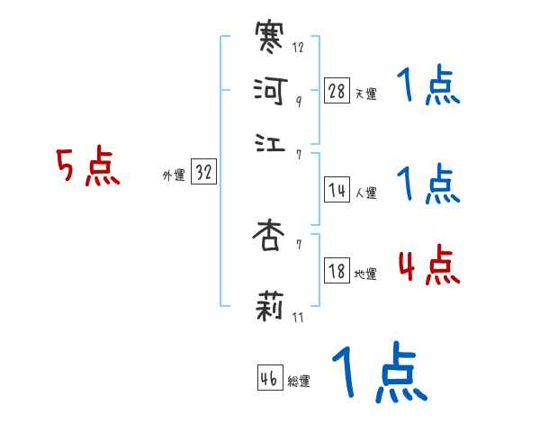外運![]() | 寒河江杏莉さんの外運は32画の5つ星!柔軟性があり成功する。チャンスが多く金運が良い。 生活面を象徴する運勢です。外部から受ける影響力を表し、結婚運、家庭運や職場、環境への順応性を表します。 |