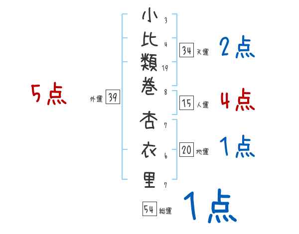 外運![]() | 小比類巻杏衣里さんの外運は39画の5つ星!社交性に優れ人望が厚い。人の上に立ち成功する。 生活面を象徴する運勢です。外部から受ける影響力を表し、結婚運、家庭運や職場、環境への順応性を表します。 |