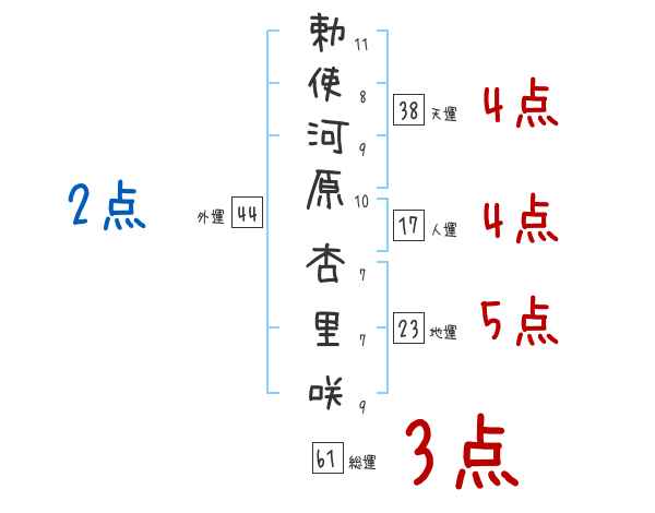 外運![]() | 勅使河原杏里咲さんの外運は44画の2つ星!誠実で慎重な性格。物事を考えすぎないように注意しましょう。 生活面を象徴する運勢です。外部から受ける影響力を表し、結婚運、家庭運や職場、環境への順応性を表します。 |