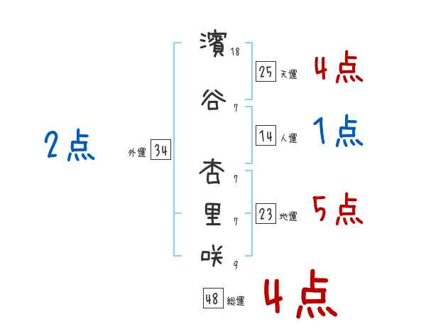 天運![]()  | 濱谷杏里咲さんの天運は25画の4つ星!個性があり才能があふれる。強運の持ち主で発展する。 家系が持つ宿命的な運勢を表します。祖先から受け継いだ苗字ですので自分の力が及びません。家柄を象徴します。 |