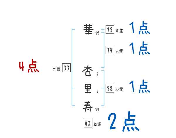 天運![]() | 華杏里寿さんの天運は12画の1つ星!簡単な失敗で諦めてしまいやすいかも。着実に行動すると良いでしょう。 家系が持つ宿命的な運勢を表します。祖先から受け継いだ苗字ですので自分の力が及びません。家柄を象徴します。 |