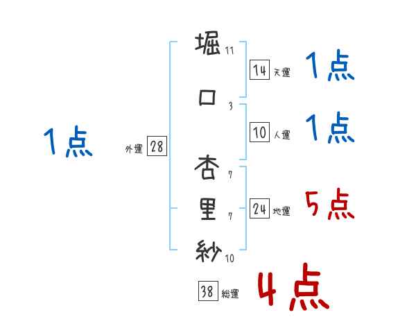 外運![]() | 堀口杏里紗さんの外運は28画の1つ星!家庭環境に注意。スポーツで活躍できる能力があるかも。 生活面を象徴する運勢です。外部から受ける影響力を表し、結婚運、家庭運や職場、環境への順応性を表します。 |