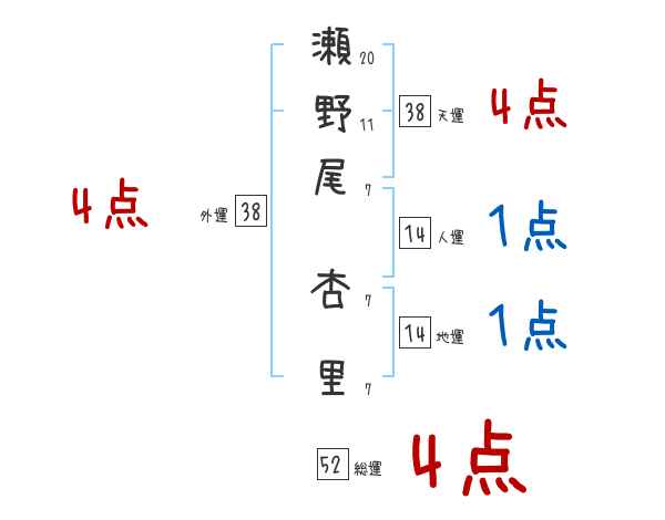 外運![]() | 瀬野尾杏里さんの外運は38画の4つ星!温厚な性格で技術的な才能を発揮する。職人的な仕事に向いている。 生活面を象徴する運勢です。外部から受ける影響力を表し、結婚運、家庭運や職場、環境への順応性を表します。 |