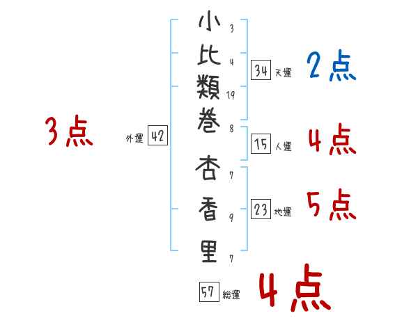 外運![]() | 小比類巻杏香里さんの外運は42画の3つ星!病気に注意。多芸であるが消極的でおとなしい。 生活面を象徴する運勢です。外部から受ける影響力を表し、結婚運、家庭運や職場、環境への順応性を表します。 |