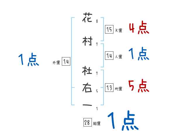 総運![]() | 花村杜右一さんの総運は28画の1つ星!家庭環境に注意。スポーツで活躍できる能力があるかも。 あなたの人生を表す1番重要な運勢です。生涯を通じて影響する総合運となり、主に50歳以降の晩年期に影響を及ぼします。 |