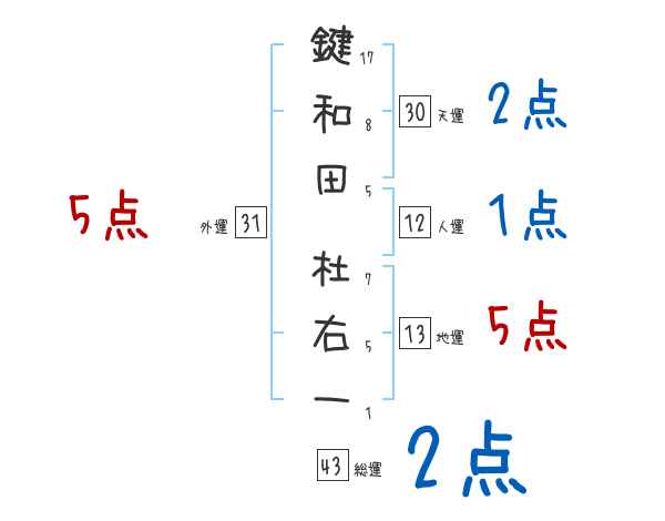 天運![]() | 鍵和田杜右一さんの天運は30画の2つ星!浮き沈みの激しさに注意しましょう。 家系が持つ宿命的な運勢を表します。祖先から受け継いだ苗字ですので自分の力が及びません。家柄を象徴します。 |