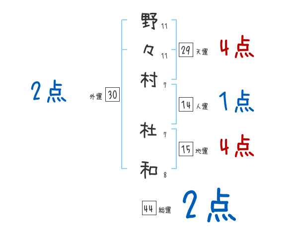 天運![]() | 野々村杜和さんの天運は29画の4つ星!完全主義で才能がある。厳格な心の持ち主。 家系が持つ宿命的な運勢を表します。祖先から受け継いだ苗字ですので自分の力が及びません。家柄を象徴します。 |