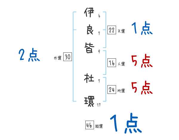 総運![]() | 伊良皆杜環さんの総運は46画の1つ星!迷走することが多く苦労するかも。目先のことにとらわれないように。 あなたの人生を表す1番重要な運勢です。生涯を通じて影響する総合運となり、主に50歳以降の晩年期に影響を及ぼします。 |