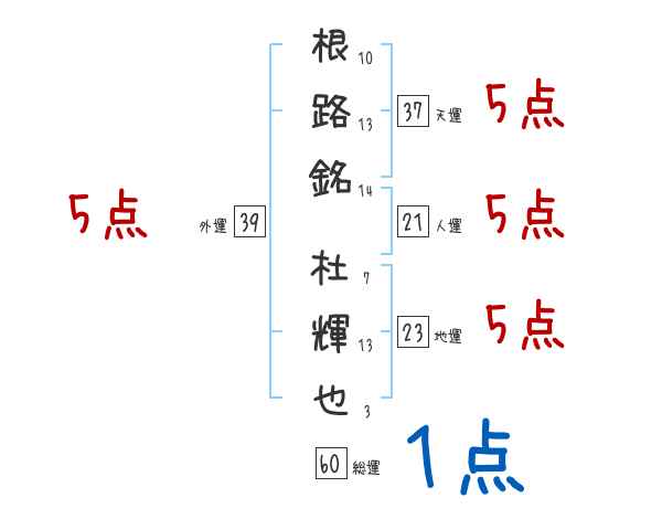 外運![]() | 根路銘杜輝也さんの外運は39画の5つ星!社交性に優れ人望が厚い。人の上に立ち成功する。 生活面を象徴する運勢です。外部から受ける影響力を表し、結婚運、家庭運や職場、環境への順応性を表します。 |