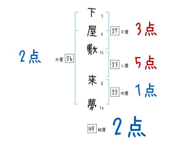 天運![]() | 下屋敷来夢さんの天運は27画の3つ星!頭脳明晰だが強情で摩擦が多い傾向。孤立に注意。 家系が持つ宿命的な運勢を表します。祖先から受け継いだ苗字ですので自分の力が及びません。家柄を象徴します。 |