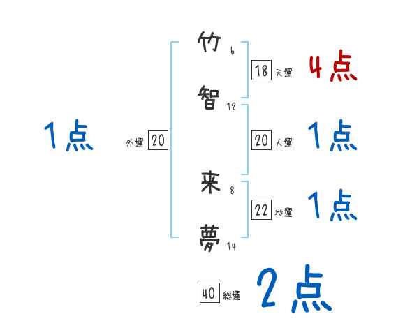 天運![]() | 竹智来夢さんの天運は18画の4つ星!情熱的で剛気。忍耐力があり信頼される。 家系が持つ宿命的な運勢を表します。祖先から受け継いだ苗字ですので自分の力が及びません。家柄を象徴します。 |
